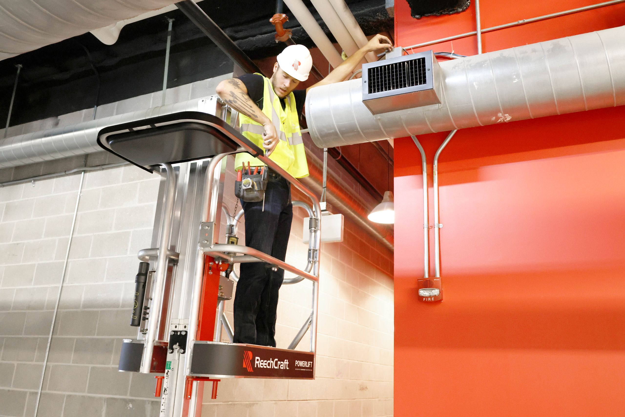 The PowerLift platform features front entrance gates, making it more ergonomic and easier to step in and get to work. It also features a large tool tray to allow you to carry all your supplies.